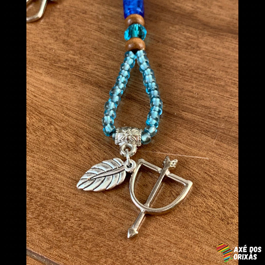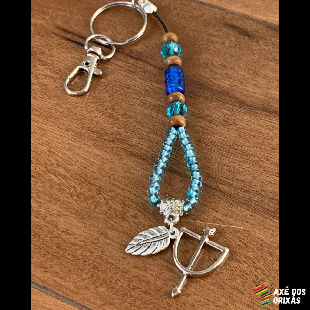 Chaveiro confeccionado em miçanga de vidro, cristal e contas de madeira, com pingente de ofá e folha.