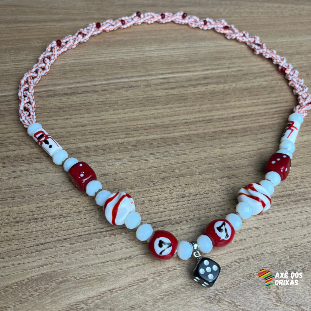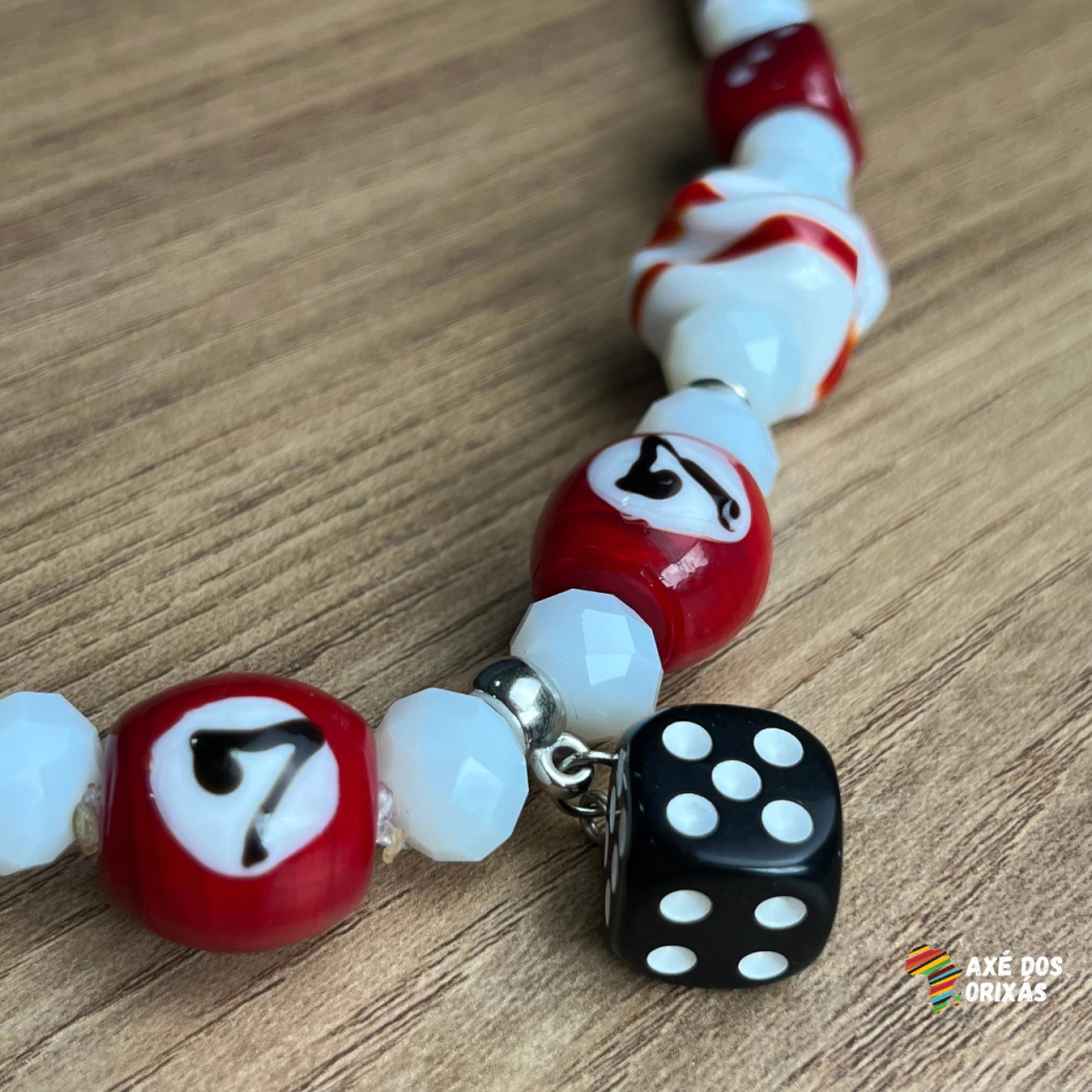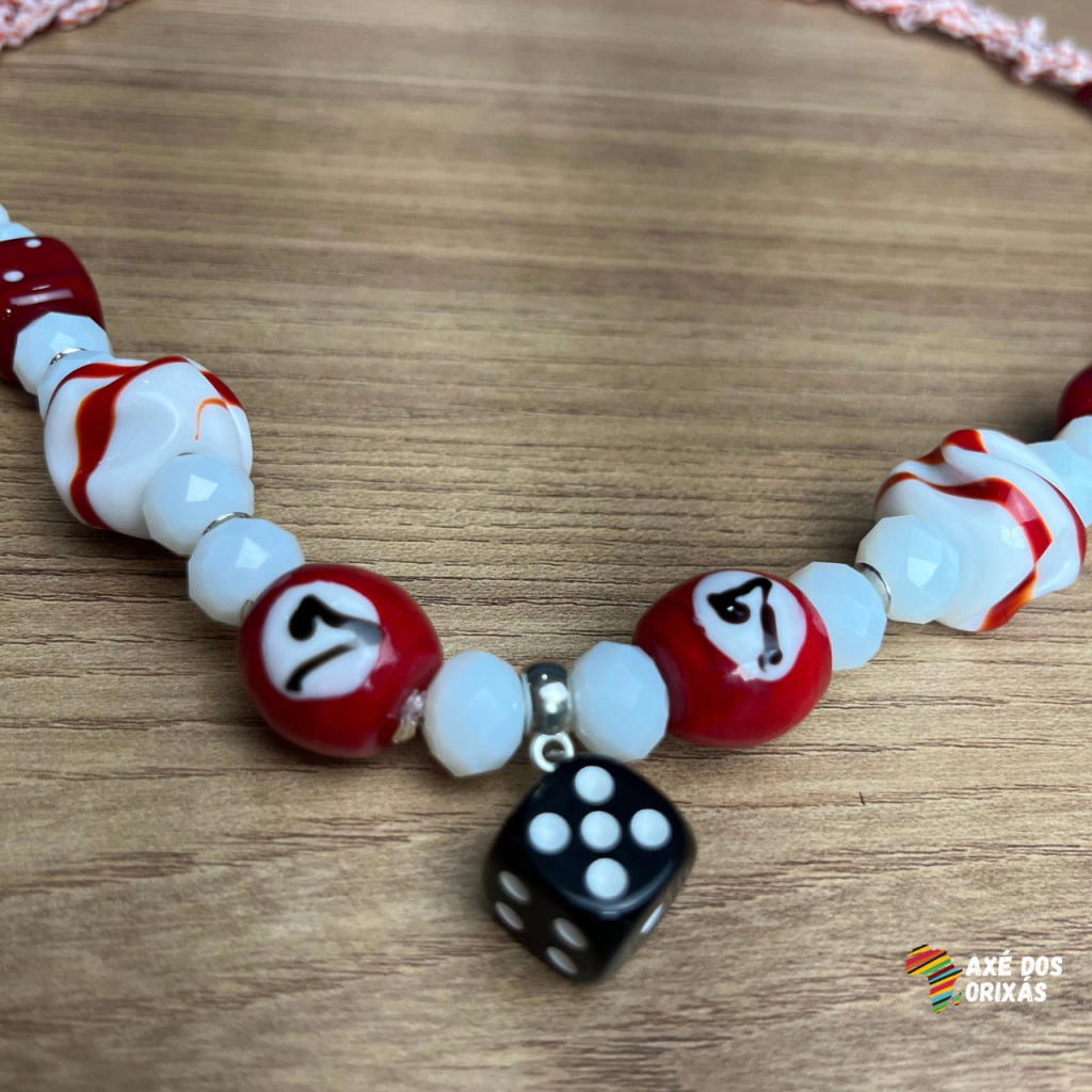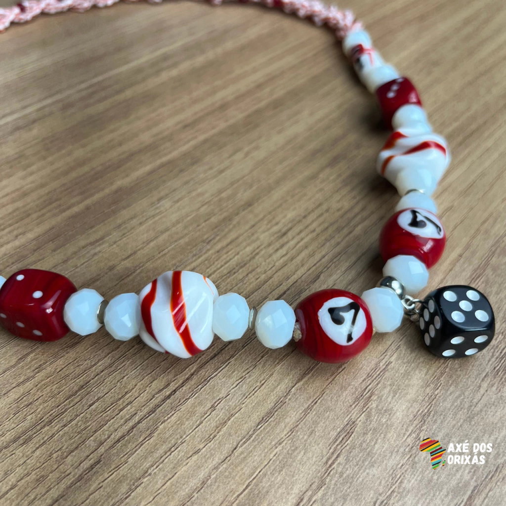 Apresentamos o Colar de Malandro, uma peça única e cheia de personalidade, confeccionada artesanalmente com miçangas de vidro trançadas. Dentro da trança, os cristais número 6 garantem brilho e sofisticação ao design. O destaque fica por conta das firmas de murano luxuosas, que representam os utensílios característicos dos malandros, como bolas de bilhar e dados, além dos pingentes em forma de dado, que trazem ainda mais autenticidade à peça.