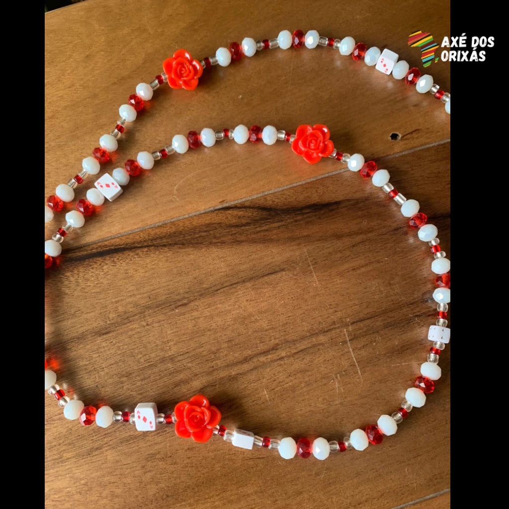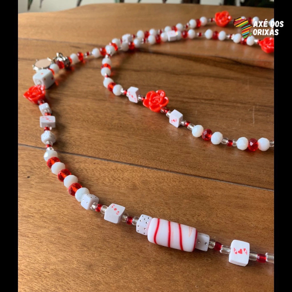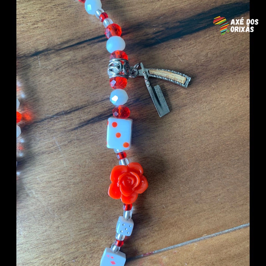 Guia confeccionada em cristais e miçanga, dados, cartas, rosas vermelhas e pingentes de navalha e pandeiro