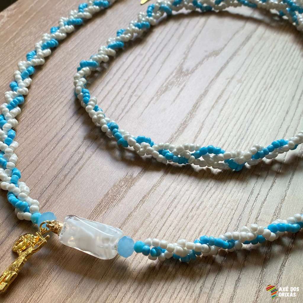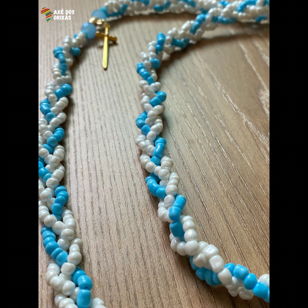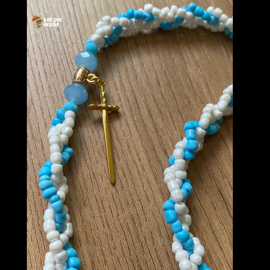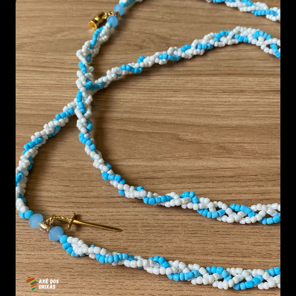 Apresentamos o deslumbrante Guia de Oxaguian, uma manifestação de força e proteção entrelaçada em fios de branco e azul, em reverência ao poderoso orixá.