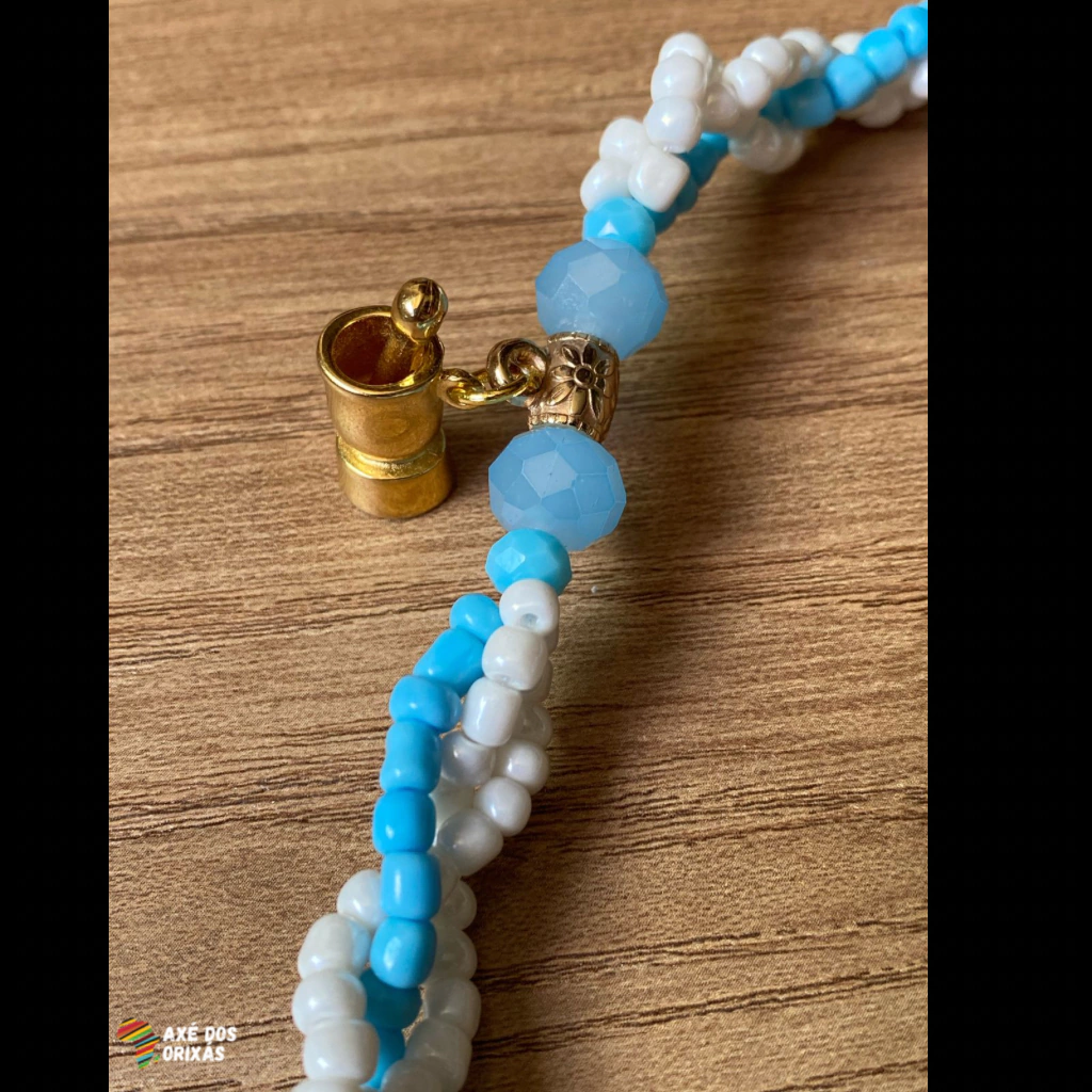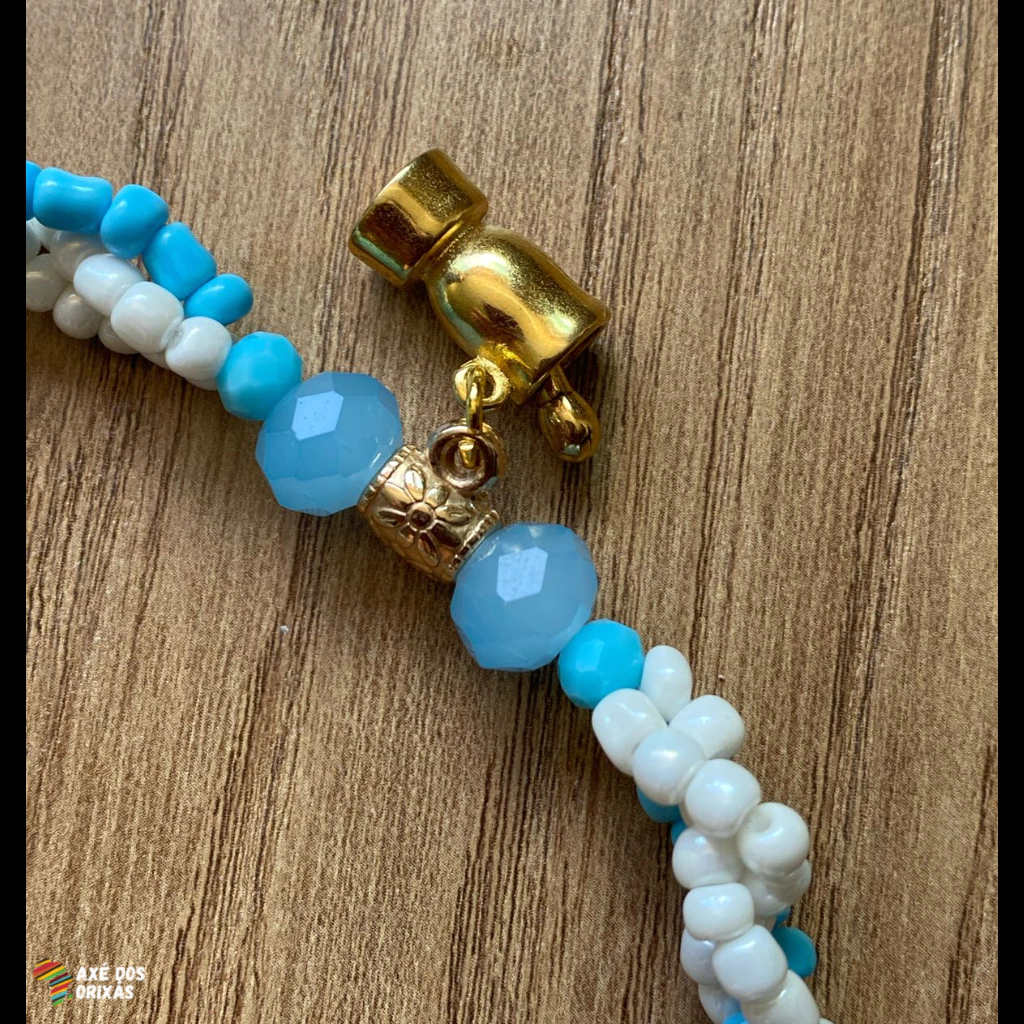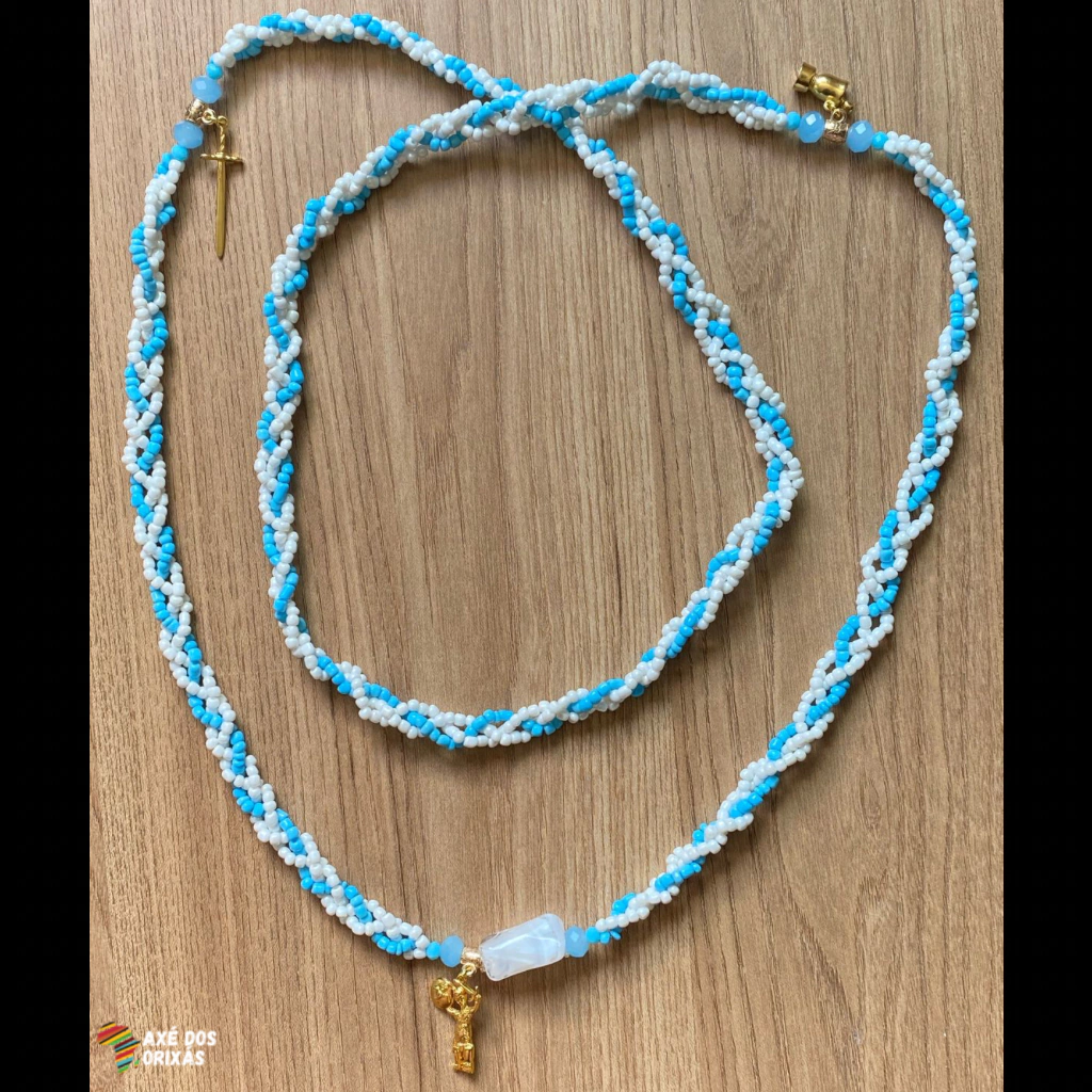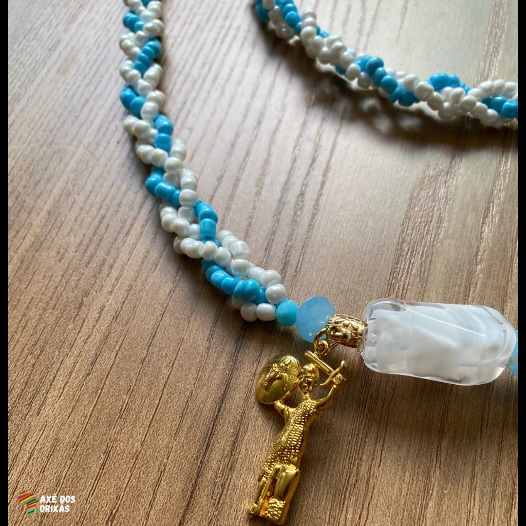 Apresentamos o deslumbrante Guia de Oxaguian, uma manifestação de força e proteção entrelaçada em fios de branco e azul, em reverência ao poderoso orixá.