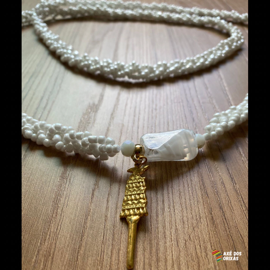 A guia de Oxalá é toda trançada em três fios de miçangas de vidro branca e cintilantes, a firma é de Murano e o pingente de metal dourado e ou prateado.