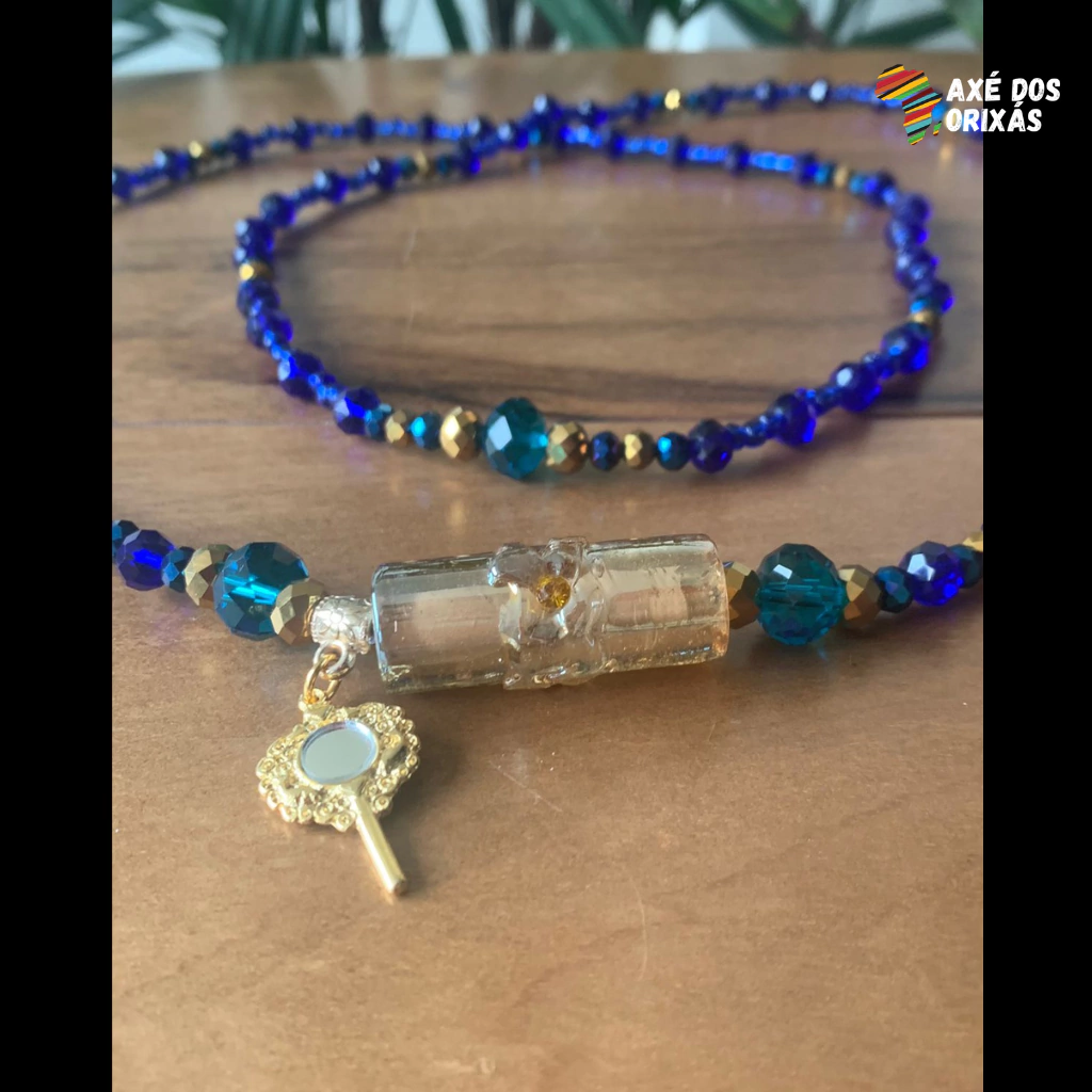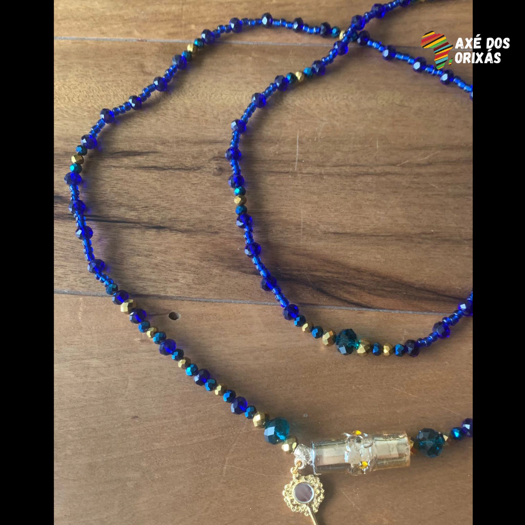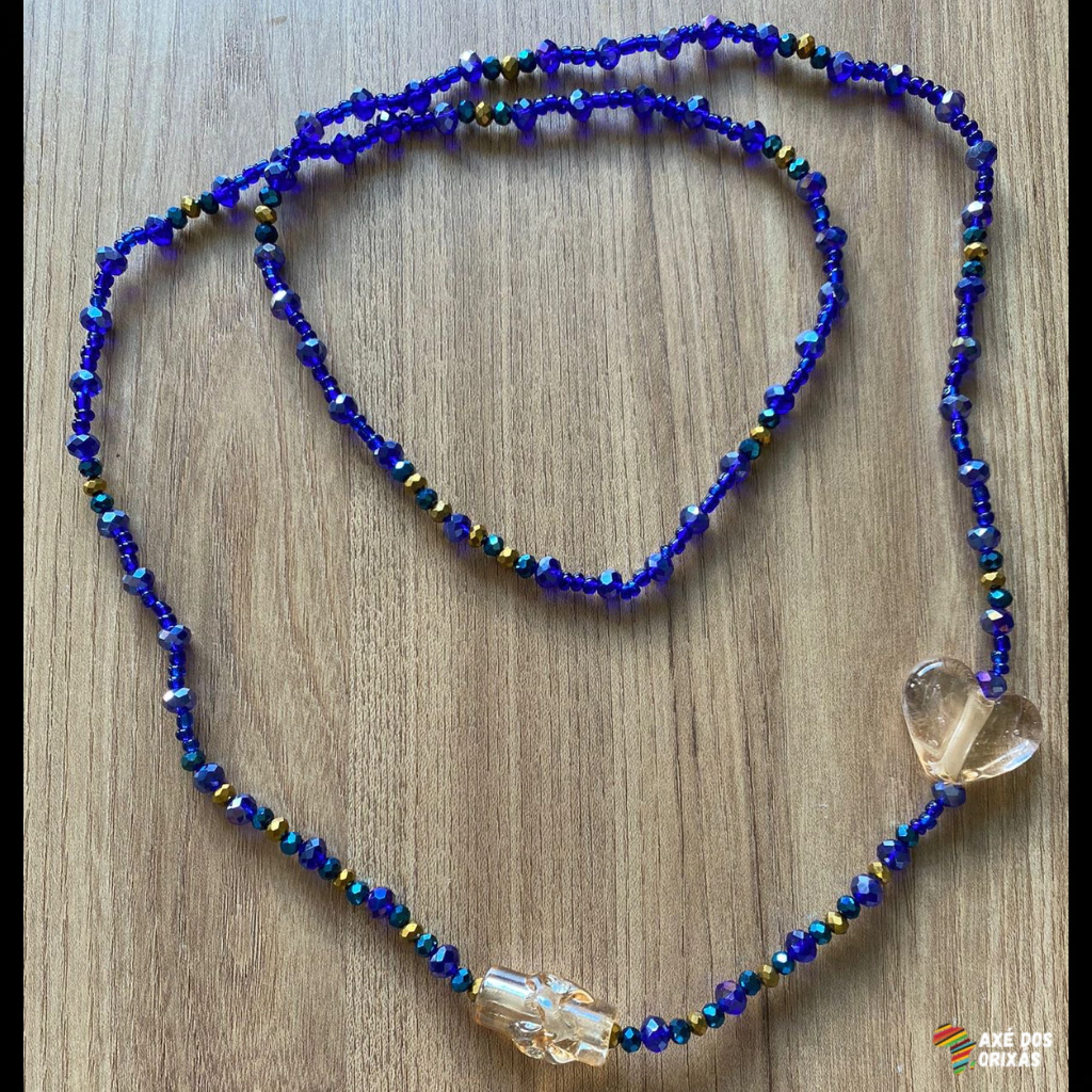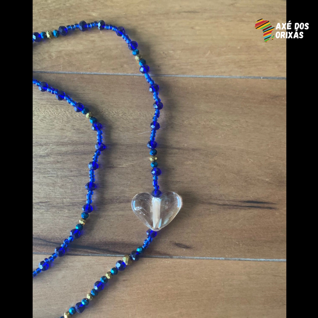 Feita no fio de naylon, com micangas de vidro, cristais azuis e dourados , coração de Murano, firma de Murano com strass, pingente de metal dourado.