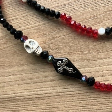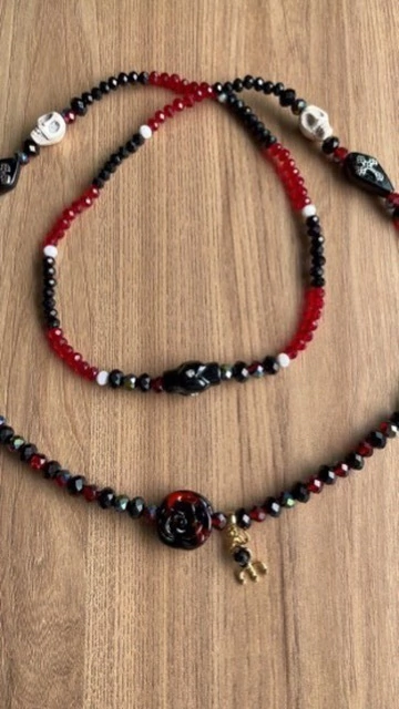 Descrição do Produto: Apresentamos a Guia de Pombagira Rosa Caveira, confeccionada em fio único e feita inteiramente de cristais, representando a força e a essência misteriosa das pombagiras. Esta peça única é confeccionada com flores e caixões de murano, além de caveiras, evocando o equilíbrio entre poder e elegância. O pingente de garfo completa a guia, realçando a conexão espiritual com a energia intensa e protetora das pombagiras.