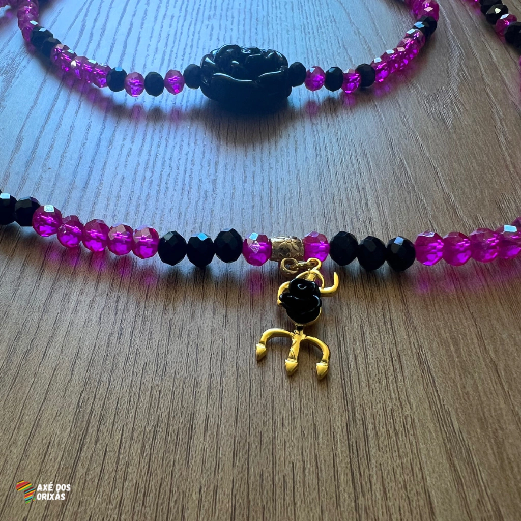 Em tons de rosa e preto, a guia reflete a paleta de cores que personifica a Pombagira, incorporando a sensualidade, o poder e a sofisticação. Os cristais cuidadosamente dispostos ao longo da guia emanam uma aura de beleza transcendentale e irradiam uma energia mística que é única para a divindade que representa.