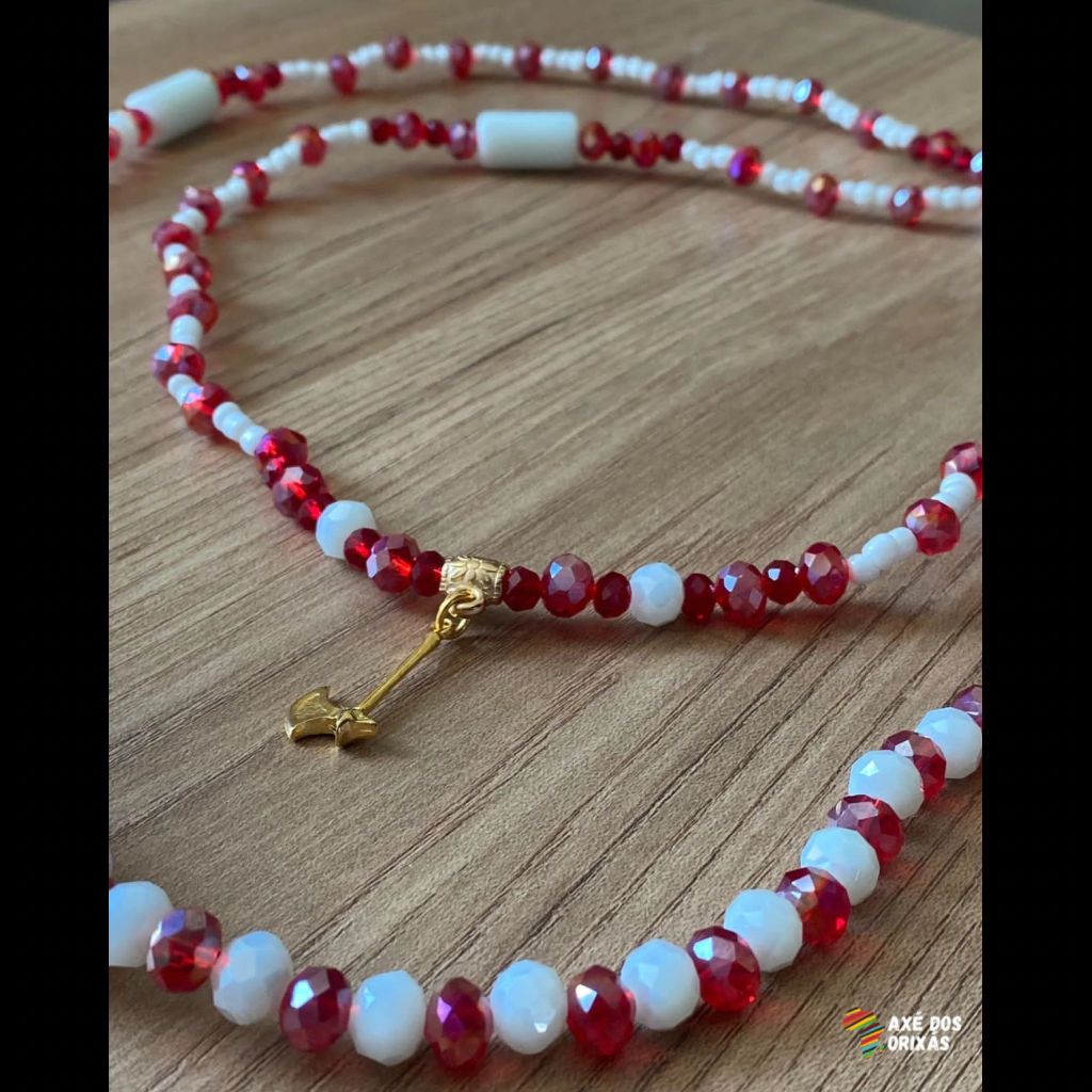 Guia de Xangô magnífico, confeccionado com cristais reluzentes, miçangas de vidro vibrantes e firmas de Murano, adornado com pingentes de metal que simbolizam a energia e a justiça de Xangô.