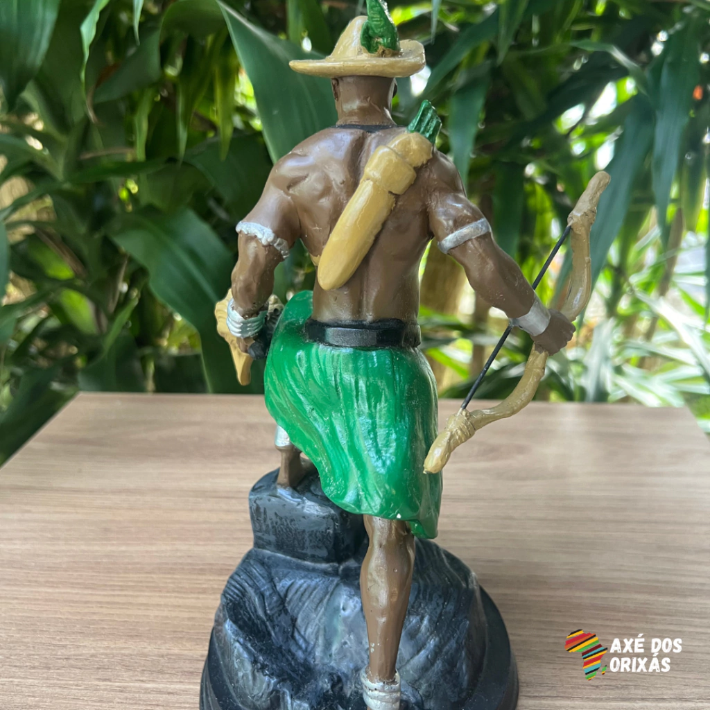 A imagem de Oxóssi em resina retrata com imponência o orixá caçador, senhor das matas, da fartura e da sabedoria. Com acabamento detalhado, a peça mostra Oxóssi com seu arco em punho, chapéu de caçador e traje verde, cor que simboliza a floresta e a abundância da natureza.